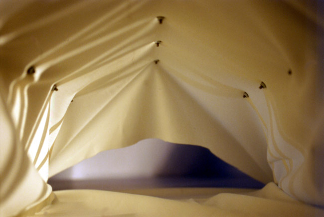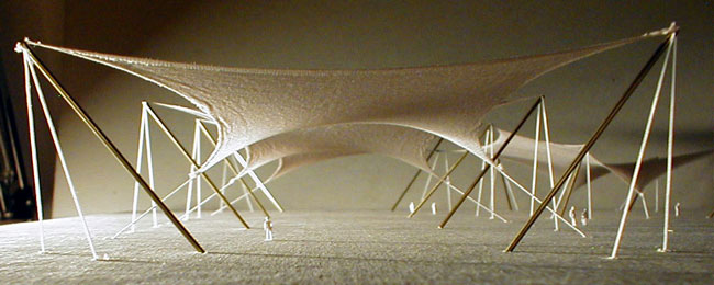 | Eine textile Membran folgt als Minimalfläche an den Längsseiten verteilten Hoch- und Tiefpunkten, ein sog. Wellenzelt, erhält dadurch Vorspannung und Festigkeit. |