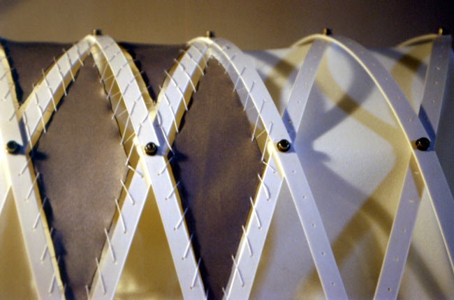 | Ausbildung der Zeltstütze an allen Knotenpunkten gelenkig, Stütze in Stahlfachwerk aufgelöstes Volumen, der Querschnitt folgt der auftretenden Biegespannung. |