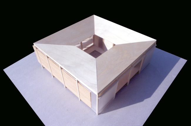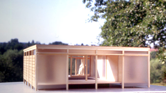 | Der Entwurf sieht einen Gebäudetyp vor, der bis zu 8 Personen Raum geben kann. Eine quadratische Grundform mit quadratischem Innenhof erzeugen Konzentration auf Wesentliches, stellen den Menschen in den Mittelpunkt christliches Menschenbild. Die vier Schlafräume sind einfach gestaltete Kammern, nur per Oberlicht natürlich belichtet. |