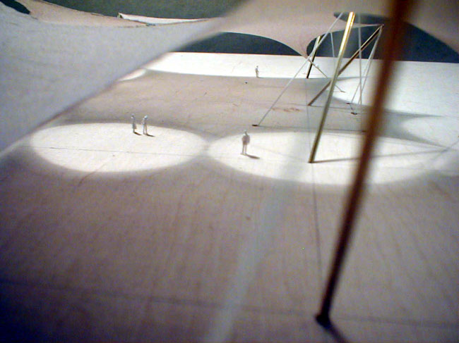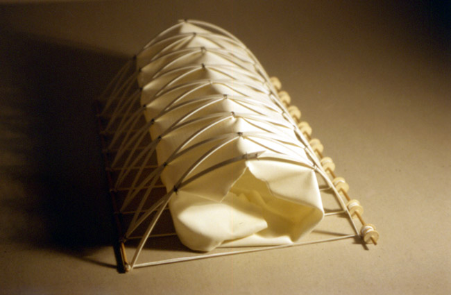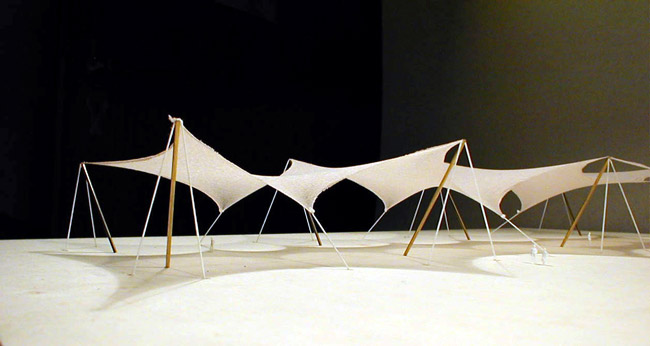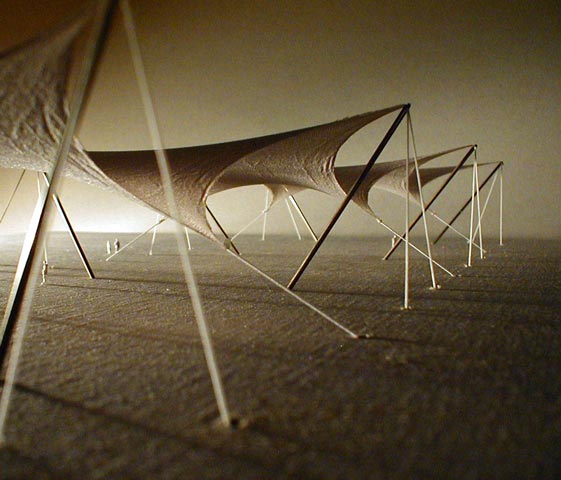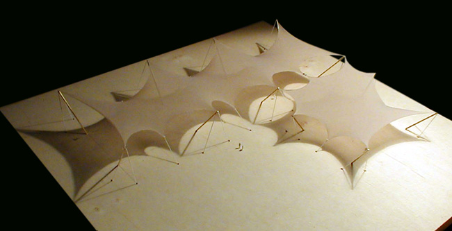 | Eine textile Membran folgt als Minimalfläche an den Längsseiten verteilten Hoch- und Tiefpunkten, ein sog. Wellenzelt, erhält dadurch Vorspannung und Festigkeit. |