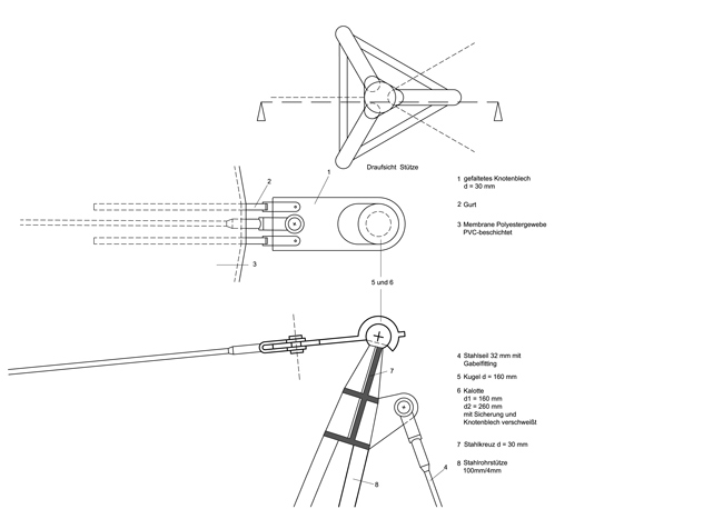 | Ausbildung der Zeltstütze an allen Knotenpunkten gelenkig, Stütze in Stahlfachwerk aufgelöstes Volumen, der Querschnitt folgt der auftretenden Biegespannung. |
