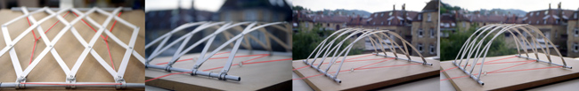 | Aufbausequenz. Kunststofftragwerk auf zwei Schienen. Eine Schiene wird fixiert. Per Winde wird die andere Schiene hergezogen. Das Tragwerk erhebt sich und erhält seine Vorspannung. |