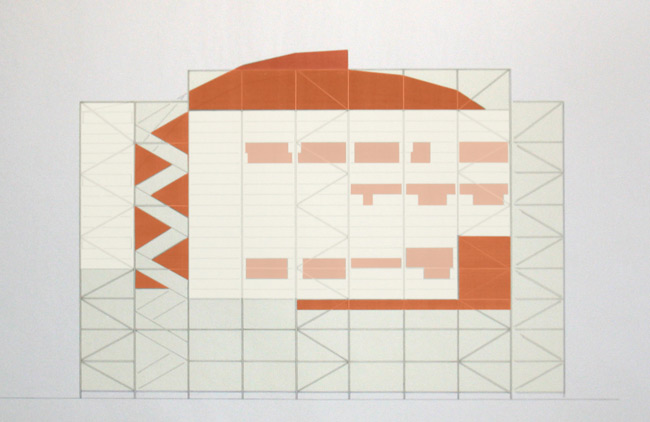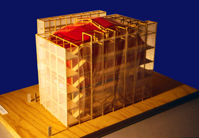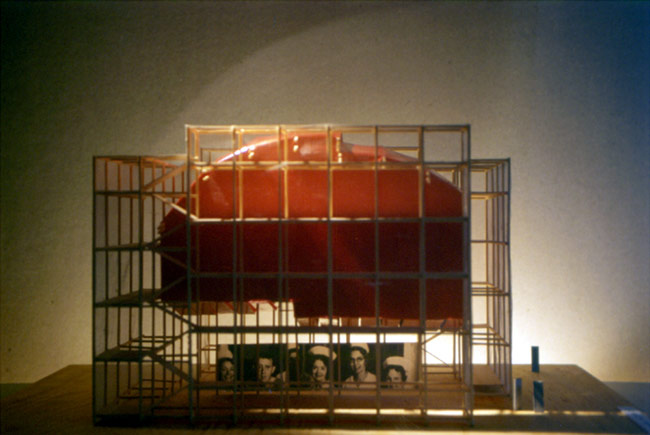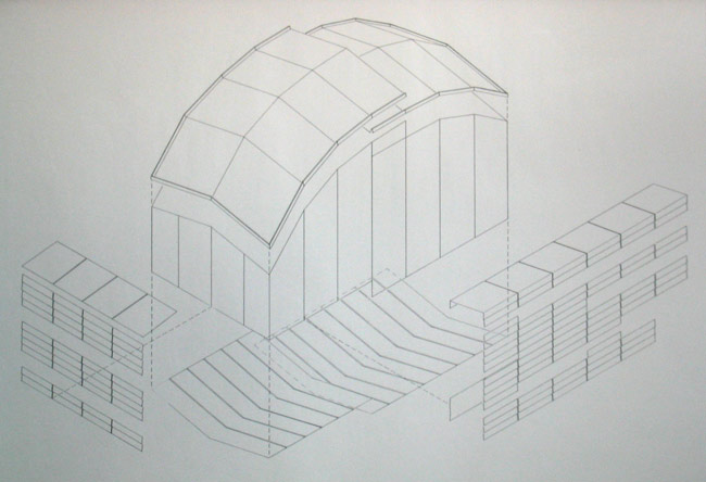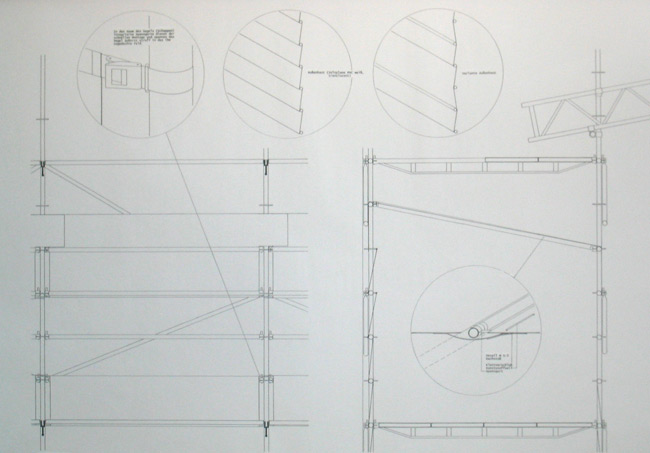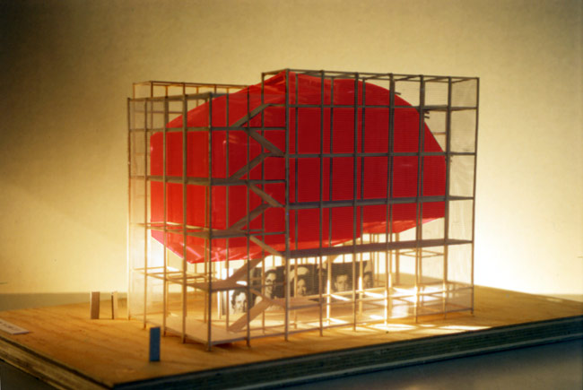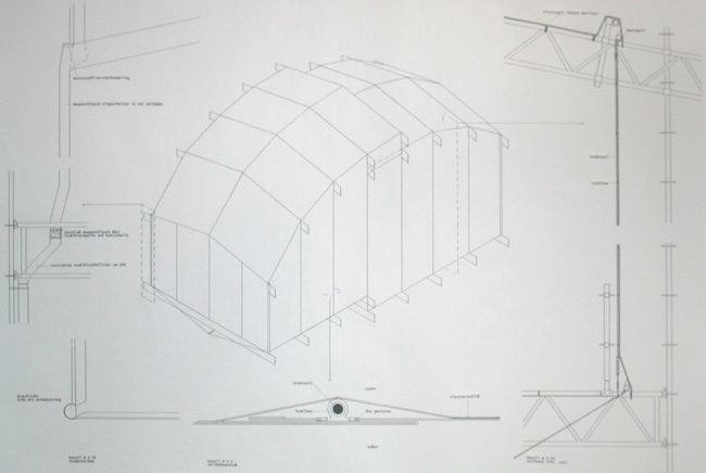 Die Tragstruktur des Bauwerks setzt sich aus Standardelementen des Gerüstbaus zusammen, die europaweit von Gerüstbaufirmen erhältlich sind. Wesentlicher Bestandteil des Konzeptes ist somit die Möglichkeit den „Rohbau“ von einem Gerüstbauer nach den Bauplänen, genauer Ortsangabe und Ausrichtung, am Spielort erstellen zu lassen. Das Bauwerk wird nur angemietet. Herstellungs-, Lager-, Transport- und Entsorgungskosten entfallen. Die Theatertechniker bringen lediglich die spezifischen Einbauten mit. In Anmutung und Typologie möchte der Bau Leichtigkeit und Losgelöstheit von der Schwere eines Massivbaus als Ausdruck von Mobilität und eines temporären Charakters vermitteln. Der Bau versteht sich als Zeltbau. Eine vertikale Komponente in Form mehrerer übereinander gelagerter Ebenen fließt mit ein. Der eigentliche Brennpunkt des Bauwerks – Bühne und Zuschauerraum – befindet sich als Ort der Konzentration in einer feuerroten Kapsel, die entrückt von Schwere und Bodenhaftung in einer Höhe von 6m vom Grund schwebt.Nebenräume, Pausenbereich und Bar befinden sich in der Schale aus Stahlrohrrahmengerüst, die den Kern umfasst. |