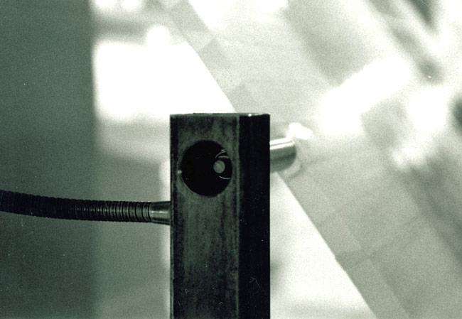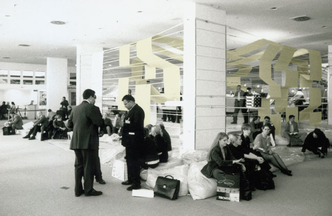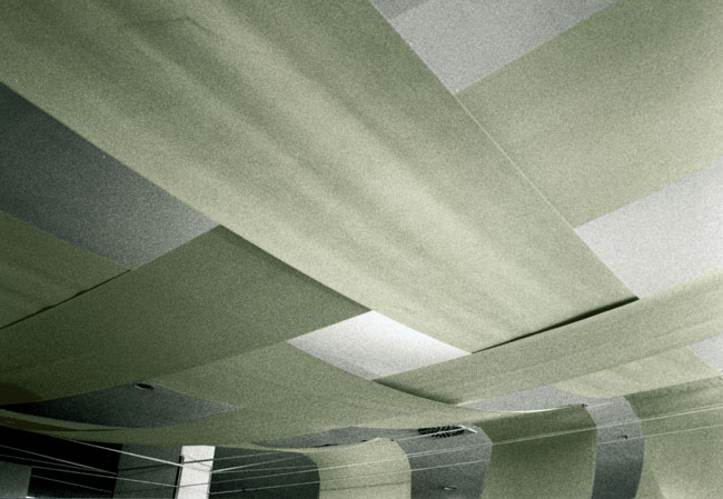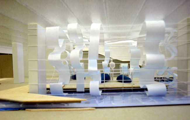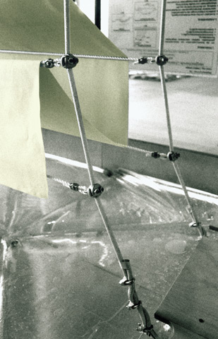 | Die Technik und das Prinzip des Webens, des Webstuhls, also die Mikrostruktur von Textilien stand Pate für eine räumliche Skulptur. Dabei gibt es horizontale Seile die unter erheblicher Spannung stehen und sich der vorhandenen Stützen bedienen und mit diesem eleganten Trick dieselbigen eliminieren. Und es gibt vertikale Bänder, welche raumformend, abschirmend ein Außen und Innen kreieren. In der puren Dimension des "Gewebes" und dem daraus resultierenden spürbar machen von Kräften gelingt der Brückenschlag zu Architektur. |