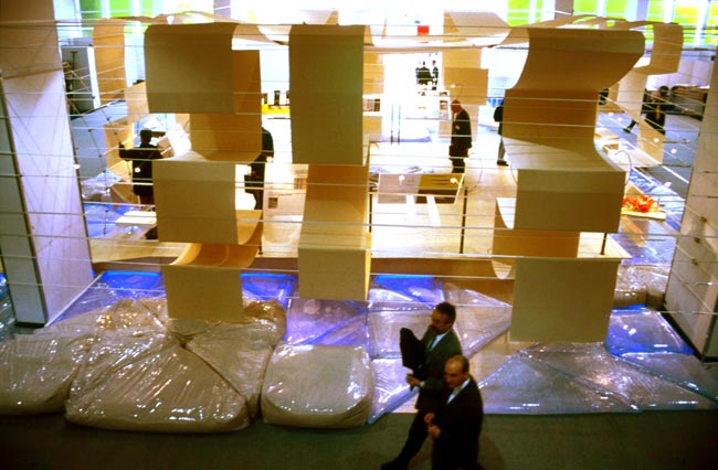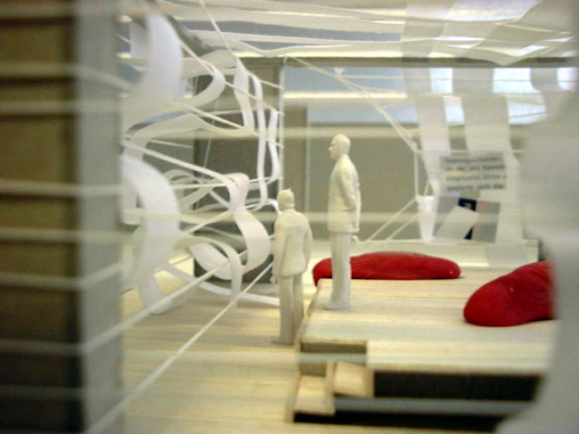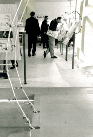 | Die Ausstellung findet im Inneren der begehbaren Großform statt. Das Volumen schafft eine räumliche Trennung und eine Zäsur zum hektischen Messebetrieb. Zusätzlich erhebt sich der Besucher auf ein 40cm hohes Podest. Dort findet er die Muße auf 12 drehbaren (beidseitig bestückt fassen sie jeweils eine Arbeit zusammen) Planhaltern die ausgezeichneten Projekte zu studieren. Die dazugehörigen Modelle findet er vor sich in den Seilwänden. |