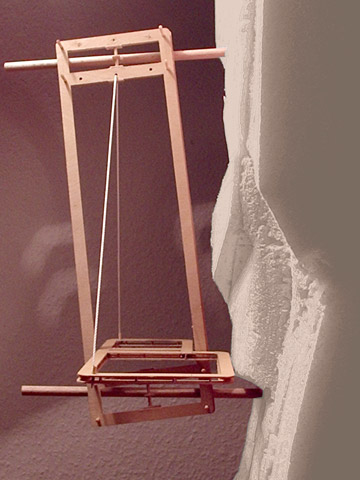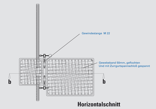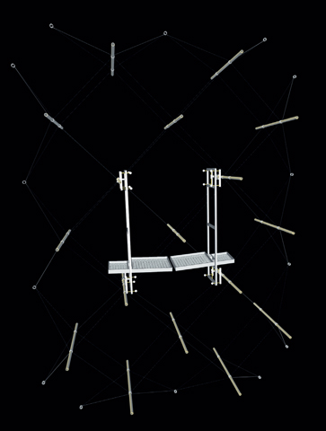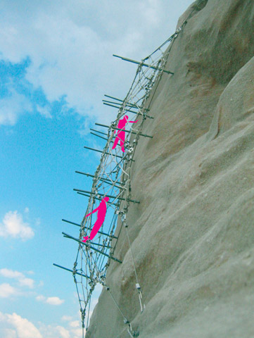 Vert liegt der Gedanke einer begehbaren bzw. durchsteigbaren Haut zugrunde, die sich über die Wandfläche legt. Nach Zusammenbau der in handlichen Taschen zu transportierenden Einzelteile zur doppelten Netzstruktur wird diese lediglich oben und unten verankert, die Randseile werden gespannt. Die räumliche Struktur die aus zwei Netzebenen (Edelstahlseil und Kunstfaserseil) und dazwischen liegenden Spannstäben (Aluminium) besteht wird nun entlang der Spannstäbe auseinandergedrückt und dadurch „aufgepumpt“ bzw. vorgespannt. Eine sichere Mobilitätszone entsteht. |